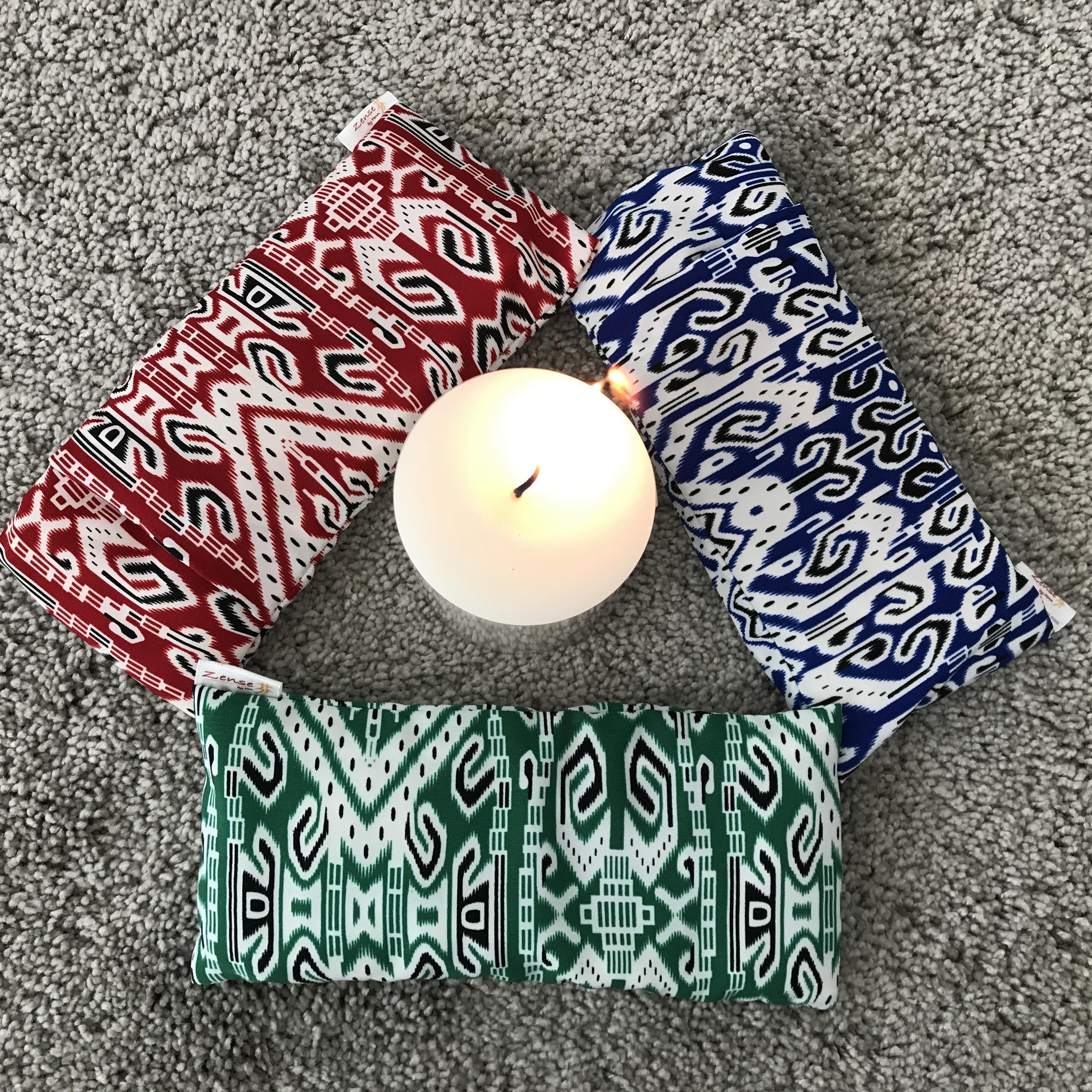 Hand sewn eye pillows with organic buckwheat and tealeaves . With a few drops of 100% essential oil, Zense eye pillows will complete your eye relaxation. Relax and enjoy.